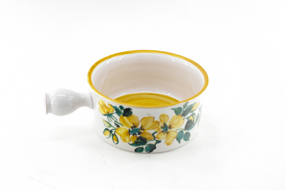 Skål med hank fra Torben Danmark Keramik. Flotte farver i blomstermotivet. Bemærk: lille afslag ved kant